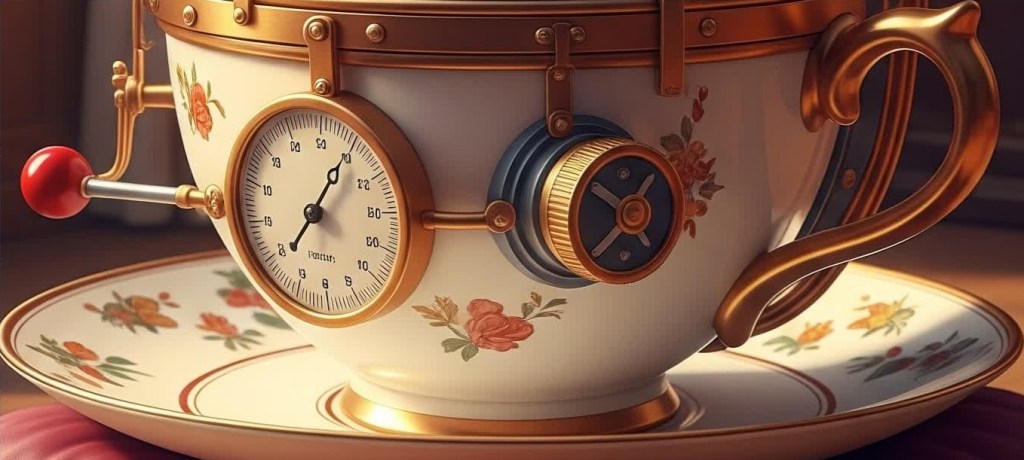 Corella’s great-grandmother always said the best inventions were born from necessity and a good cup of tea. So, it was no surprise that Corella’s latest invention was a time machine disguised as a porcelain teacup. It had a delicate floral pattern belying the intricate brass gears, miniature levers, and a tiny, ticking clock face embedded in its side.